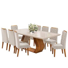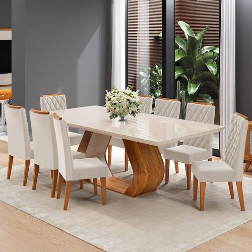 Conjunto Sala de Jantar 8 Lugares Retangular Oversized, ideal para quem busca sofisticação, conforto e muito espaço para reunir a família. Seu tampo 2,00x90 em MDF 4,0cm com vidro oferece resistência, elegância e um acabamento refinado para valorizar o ambiente. Os cantos arredondados proporcionam mais segurança no dia a dia e deixam o design ainda mais moderno e harmonioso. As cadeiras em MDP/MDF garantem estrutura firme e boa durabilidade, perfeitas para o uso diário. O encosto bordado com espaldar traz um toque de charme e sofisticação, destacando a beleza do conjunto. Os assentos com espuma D26 oferecem maior conforto, enquanto o revestimento em tecido veludo garante maciez e requinte. Uma excelente opção para transformar sua sala de jantar em um espaço acolhedor, elegante e funcional. Medida da Mesa (A x L x P): A:77,8 x L:200 x P:90cm Peso da Mesa: 66,6 kg Mesa suporta até: 50 kg Acabamento da Cadeira/Banco: Pintura UV Acabamento da Mesa: Pintura UV Acompanha Manual de Instalação: Sim Ambiente Principal: Sala de Jantar Cadeira/Banco Estofada: Encosto e Assento Estofados Cadeira/Banco estofada: Encosto e Assento Estofados Cadeira/Banco Suporta Até: 90.0000 Cadeira/Banco suporta até: 90 kg codigo_ean: 7900288361936 Complexidade da Montagem: Média: pode ser montado por mais de uma pessoa e/ou necessite de maior conhecimento para montagem Configuração do Conjunto: Mesa com Cadeiras Cor: Mel/Off White/Bege Cor das Cadeiras: Bege Cor do Produto: Mel/Off White/Bege Cor Secundária: Bege De Canto (Canto Alemão): Não Enchimento do Assento: Espuma D-26 Escala de Brilho: Semi-Brilho Espessura do Tampo: 40 mm Estrutura do Assento: MDF Estrutura do Encosto: MDF/MDP Formato do Tampo: Retangular Informações Complementares: Sala de Jantar 8 lugares Itens Inclusos: 1 Mesa, 8 Cadeiras, Kit Ferragem e Manual de Montagem Largura do Conjunto: 200 cm Linha ou Coleção: Oversized Manual de Montagem e Instalação: https://product-hub-prd.madeiramadeira.com.br/316285368/documents/cf9f09bc-7a55-4cef-b98a-f8bf60dcb513346023952817744630015688.pdf Marca: Viero Material da Base da Mesa: MDF/MDP Material da Estrutura da Cadeira: MDF/MDP Material do Tampo: Vidro/MDF Material Principal: MDF/MDP Material Principal das Cadeiras/Bancos: MDF/MDP Medida da Cadeira/Banco (A x L x P): A:101 x L:42 x P:58,5cm Medida do Tampo (L x C x E): L:200 x C:90 x E:4,0cm Mesa Extensível: Não Necessita Montagem: Sim Origem do Produto: Nacional Peso da Cadeira/Banco: 8,05 kg Possui Apoio Para os Pés: Não Possui Vidro: Sim Profundidade do Conjunto: 90 cm Quantidade de Cadeiras: 8 Quantidade de Lugares: 08 Recomendações de Uso, Manutenção e Limpeza: limpar com pano levemente umedecido em água Revestimento da Cadeira/Banco: Veludo Sistema de Montagem: Parafusos, cavilhas