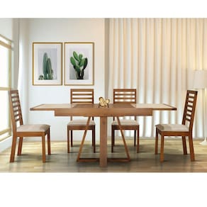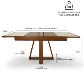A Mesa suporta até 30kg e a cadeira até 120kg cada. Medida da Mesa (A x L x P): 76 x 78 x 120/178 Peso da Mesa: 30 kg Mesa suporta até: 20 kg Acabamento da Cadeira/Banco: Acetinado Acabamento da Mesa: Verniz Acompanha Manual de Instalação: Sim Almofada do assento: Fixa Ambiente Principal: Cozinha Cadeira/Banco estofada: Somente Assento Estofado Cadeira/Banco suporta até: 120 kg Complexidade da Montagem: Média: pode ser montado por mais de uma pessoa e/ou necessite de maior conhecimento para montagem Cor: Pinhão Cor da Base: Marrom Cor do Produto: Pinhão Cor do Tampo: Marrom Cor Secundária: Marrom De Canto (Canto Alemão): Não Design da Base: Retangular Escala de Brilho: Semi-Fosco Espessura do Tampo: 4 mm Estrutura do Assento: Espuma Estrutura do Encosto: Madeira Maciça Formato do Tampo: Retangular Itens Inclusos: 1 Mesa, 6 Cadeiras e manal de montagem Manual de Especificação Técnica: https://product-hub-prd.madeiramadeira.com.br/932749/documents/653c0918-9865-4a0a-aaa3-25ee3636cbe42240473452817241592437404.pdf Manual de Montagem e Instalação: https://product-hub-prd.madeiramadeira.com.br/932749/documents/9a0e2289-12f8-4e19-95a3-5856919e1bdd2240472452817241592388173.pdf Material da Base da Mesa: Madeira Maciça Material da Estrutura da Cadeira: Madeira Maciça Material do Tampo: Madeira Maciça Material Principal: Madeira Maciça Material Principal das Cadeiras/Bancos: Madeira Maciça Medida da Base (A x L x P): 67 x 75 x 60 Medida da Cadeira/Banco (A x L x P): 96 x 44 x 49 Medida do Tampo (L x C x E): 78 x 120 x 76 Mesa Dobrável: Não Mesa Extensível: Sim Necessita Montagem: Sim Origem do Produto: Nacional Peso da Cadeira/Banco: 7,5 kg Possui Apoio para Braços: Não Possui Apoio Para os Pés: Não Possui Prateleiras: Não Possui Rodízio: Não Possui Suporte Giratório: Não Possui Vidro: Não Quantidade de Cadeiras: 06 Quantidade de Lugares: 06 Recomendações de Uso, Manutenção e Limpeza: Limpeza, apenas com pano úmido Sistema de Montagem: Parfusos e Cavilhas Tipo de Assento: Fixo Tipo de Encosto: Fixo Tipo de Madeira Maciça da Base da Mesa: Pinus Tipo de Madeira Maciça do Tampo: Pinus