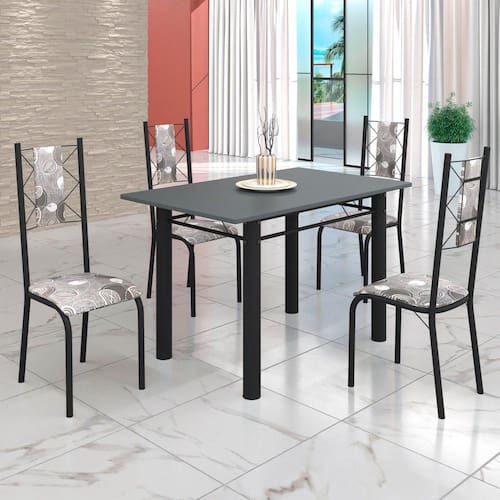 O Conjunto Sala de Jantar Bahia é uma ótima escolha para quem busca combinar estilo e praticidade. Este conjunto apresenta uma mesa retangular com um design elegante e moderno, acompanhada por quatro cadeiras. A mesa tem uma estrutura tubular de 3", que oferece estabilidade ao conjunto. O tampo de madeira MDP grafite não apenas adiciona um toque de sofisticação, mas também oferece durabilidade e resistência às atividades cotidianas. Sua tonalidade grafite é versátil e se adapta facilmente a uma variedade de estilos de decoração. As quatro cadeiras incluídas no conjunto apresentam um design que combina harmoniosamente com a mesa. Seu conforto é garantido pelo estofamento e pelo assento anatômico. O conjunto Bahia se adapta bem a diferentes espaços. Acabamento da Cadeira/Banco: Pintura Texturizada Acabamento da Mesa: Pintura Texturizada Acompanha Manual de Instalação: Sim Almofada do assento: Fixa Ambiente Principal: Sala de Jantar Cadeira/Banco estofada: Sim Cadeira/Banco suporta até: 120 Complexidade da Montagem: Média: pode ser montado por mais de uma pessoa e/ou necessite de maior conhecimento para montagem Cor: Paraopeba/Preto Fosco Cor do Produto: Paraopeba/Preto Fosco Enchimento do Assento: Espuma D-12 Enchimento do Encosto: Espuma D-12 Escala de Brilho: Semi-Fosco Espessura do Tampo: 15 Estrutura do Assento: MDP de 15mm, espuma 1,2mm, courino, ferro 4,5. Estrutura do Encosto: MDP de 15mm, espuma 1,2mm, courino, ferro 4,5. Formato do Tampo: Retangular Itens Inclusos: 1 Mesa, 4 Cadeiras, Kit Ferragens e Manual de Montagem Linha ou Coleção: Bahia Manual de Montagem e Instalação: https://cdn2.madeiramadeira.com.br/atributo/moveis-teixeira/1496142-cadeira-bahia-e-tampo-mdp.pdf Material da Base da Mesa: Aço Material da Estrutura da Cadeira: Aço Material Principal das Cadeiras/Bancos: Aço Medida da Base (A x L x P): 75,5cm x 65cm x 85,5cm Medida da Cadeira/Banco (A x L x P): 100cm x 36cm x 52cm Medida da Mesa (A x L x P): 75cm x 120cm x 75cm Medida do Tampo (L x C x E): 120cm x 75cm x 1,5cm Mesa suporta até: 8 Necessita Montagem: Sim Origem do Produto: Nacional Peso da Cadeira/Banco: 3.04 Peso da Mesa: 16.15 Possui Apoio para Braços: Não Possui Apoio Para os Pés: Não Possui Rodízio: Não Recomendações de Uso, Manutenção e Limpeza: Pano levemente umedecido e pano seco. Não utilizar produtos de limpeza Revestimento da Cadeira/Banco: Courino Sistema de Montagem: Parafusos Ean: 7909903410936