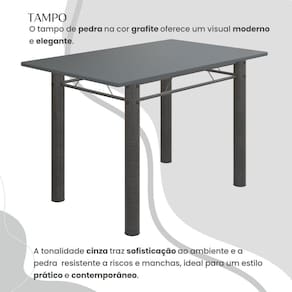 O Conjunto Sala de Jantar Bahia é uma ótima escolha para quem busca combinar estilo e praticidade. Ele apresenta uma mesa retangular com um design elegante e moderno, acompanhada por quatro cadeiras. A mesa tem uma estrutura tubular de 3", que oferece estabilidade ao conjunto. O tampo em pedra grafite oferece um visual moderno e sofisticado. A tonalidade do grafite confere elegância e versatilidade ao ambiente, enquanto a pedra proporciona durabilidade e resistência a riscos e manchas. Essa combinação de estética e funcionalidade cria um aspecto contemporâneo e prático, tornando o tampo em pedra grafite uma escolha marcante para adicionar estilo e resistência à sua sala de jantar. As quatro cadeiras incluídas no conjunto apresentam um design que combina harmoniosamente com a mesa.