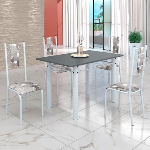 O Conjunto Sala de Jantar Bahia é uma ótima escolha para quem busca combinar estilo e praticidade. Ele apresenta uma mesa retangular com um design elegante e moderno, acompanhada por quatro cadeiras. A mesa tem uma estrutura tubular de 3", que oferece estabilidade ao conjunto. O tampo em pedra grafite oferece um visual moderno e sofisticado. A tonalidade do grafite confere elegância e versatilidade ao ambiente, enquanto a pedra proporciona durabilidade e resistência a riscos e manchas. Essa combinação de estética e funcionalidade cria um aspecto contemporâneo e prático, tornando o tampo em pedra grafite uma escolha marcante para adicionar estilo e resistência à sua sala de jantar. As quatro cadeiras incluídas no conjunto apresentam um design que combina harmoniosamente com a mesa. Acabamento da Cadeira/Banco: Pintura Texturizada Acabamento da Mesa: Pintura UV Acompanha Manual de Instalação: Sim Almofada do assento: Fixa Almofada do encosto: Fixa Ambiente Principal: Sala de Jantar Cadeira/Banco estofada: Sim Cadeira/Banco suporta até: 120 Complexidade da Montagem: Média: pode ser montado por mais de uma pessoa e/ou necessite de maior conhecimento para montagem Cor: Paraopeba/Branco Cor do Produto: Paraopeba/Branco Cor do Tampo: Cinza De Canto (Canto Alemão): Não Enchimento do Assento: Espuma D-12 Enchimento do Encosto: Espuma D-12 Escala de Brilho: Semi-Fosco Espessura do Tampo: 18 Estrutura do Assento: Aço Estrutura do Encosto: MDP de 15mm, espuma 1,2mm, courino, ferro 4,5. Formato do Tampo: Retangular Itens Inclusos: 1 Mesa, 4 Cadeiras, Kit Ferragens e Manual de Montagem Linha ou Coleção: Bahia Manual de Montagem e Instalação: https://cdn2.madeiramadeira.com.br/atributo/moveis-teixeira/1495440-cadeira-bahia-tampo-pedra.pdf Material da Base da Mesa: Aço Material da Estrutura da Cadeira: Aço Material Principal das Cadeiras/Bancos: Aço Medida da Base (A x L x P): 75,5cm x 65cm x 85,5cm Medida da Cadeira/Banco (A x L x P): 100cm x 36cm x 52cm Medida da Mesa (A x L x P): 75cm x 120cm x 75cm Medida do Tampo (L x C x E): 120cm x 75cm x 1,8cm Mesa Dobrável: Não Mesa Extensível: Não Mesa suporta até: 8 Necessita Montagem: Sim Origem do Produto: Nacional Peso da Cadeira/Banco: 3.04 Peso da Mesa: 49.76 Possui Apoio para Braços: Não Possui Apoio Para os Pés: Não Possui Prateleiras: Não Possui Rodízio: Não Possui Suporte Giratório: Não Possui Vidro: Não Quantidade de Cadeiras: 4 Recomendações de Uso, Manutenção e Limpeza: Usar um pano de tecido macio e seco, evitar detergentes, alvejantes e produtos químicos de limpeza; no tampo usar tecido macio levemente umedecido. Revestimento da Cadeira/Banco: Courino Sistema de Montagem: Parafusos Tipo de Assento: Fixo Tipo de Encosto: Estofado Ean: 7909903410684