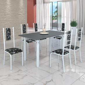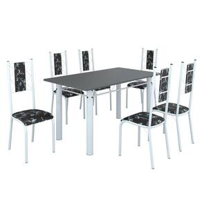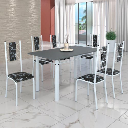 Conjunto Sala de Jantar Bahia Mesa Tubo 140x75cm Tampo Madeira com 6 Cadeiras Preto Floral/Branco