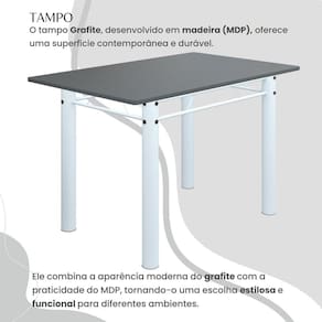 O Conjunto Sala de Jantar Bahia é uma ótima escolha para quem busca combinar estilo e praticidade. Este conjunto apresenta uma mesa retangular com um design elegante e moderno, acompanhada por seis cadeiras. A mesa tem uma estrutura tubular de 3", que oferece estabilidade ao conjunto. O tampo de madeira MDP grafite não apenas adiciona um toque de sofisticação, mas também oferece durabilidade e resistência às atividades cotidianas. Sua tonalidade grafite é versátil e se adapta facilmente a uma variedade de estilos de decoração. As seis cadeiras incluídas no conjunto apresentam um design que combina harmoniosamente com a mesa. Seu conforto é garantido pelo estofamento e pelo assento anatômico. O conjunto Bahia se adapta bem a diferentes espaços. Ideal para receber convidados.