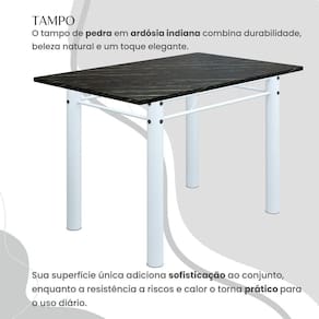 O Conjunto Sala de Jantar Bahia é uma ótima escolha para quem busca combinar estilo e praticidade. Este conjunto apresenta uma mesa retangular com um design elegante e moderno, acompanhada por seis cadeiras. A mesa tem uma estrutura tubular de 3", que oferece estabilidade ao conjunto. O tampo em ardósia indiana oferece uma estética rústica e elegante. A ardósia indiana é conhecida por sua durabilidade e beleza marroml. Sua superfície proporciona um visual autêntico e sofisticado, além de ser resistente a riscos e manchas, tornando-a uma escolha prática para uso diário. A ardósia indiana adiciona um toque de charme marroml e uma sensação acolhedora ao ambiente, tornando-se um destaque na decoração. As seis cadeiras incluídas no conjunto apresentam um design que combina harmoniosamente. Acabamento da Cadeira/Banco: Pintura Texturizada Acabamento da Mesa: Pintura Texturizada Acompanha Manual de Instalação: Sim Almofada do assento: Fixa Ambiente Principal: Sala de Jantar Cadeira/Banco estofada: Sim Cadeira/Banco suporta até: 120 Complexidade da Montagem: Média: pode ser montado por mais de uma pessoa e/ou necessite de maior conhecimento para montagem Cor: Marrom/Branco Cor do Produto: Marrom/Branco Enchimento do Assento: Espuma D-12 Escala de Brilho: Semi-Fosco Espessura do Tampo: 18 Estrutura do Assento: Assento em MDP de 15mm c/ courino. Formato do Tampo: Retangular Itens Inclusos: 1 Mesa, 6 Cadeiras, Kit Ferragens e Manual de Montagem Linha ou Coleção: Bahia Manual de Montagem e Instalação: https://cdn2.madeiramadeira.com.br/atributo/moveis-teixeira/1515347-base-3-1-40-pedra.pdf Material da Base da Mesa: Aço Material da Estrutura da Cadeira: Aço Material Principal das Cadeiras/Bancos: Aço Medida da Base (A x L x P): 75,5cm x 65cm x 112cm Medida da Cadeira/Banco (A x L x P): 100cm x 36cm x 52cm Medida da Mesa (A x L x P): 75cm x 140cm x 75cm Medida do Tampo (L x C x E): 140cm x 75cm x 1,8cm Mesa suporta até: 8 Necessita Montagem: Sim Origem do Produto: Nacional Peso da Cadeira/Banco: 3.04 Peso da Mesa: 57.4 Possui Apoio para Braços: Não Possui Apoio Para os Pés: Não Possui Rodízio: Não Possui Suporte Giratório: Não Quantidade de Cadeiras: 6 Recomendações de Uso, Manutenção e Limpeza: Usar um pano de tecido macio e seco, evitar detergentes, alvejantes e produtos químicos de limpeza; no tampo usar tecido macio levemente umedecido. Revestimento da Cadeira/Banco: Courino Sistema de Montagem: Parafusos Tipo de Assento: Fixo Tipo de Encosto: Estofado Ean: 7909903412152