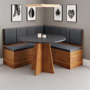 Conjunto Sala de Jantar Canto Alemão Liebe com Mesa Fin é a escolha perfeita para transformar sua cozinha ou sala de jantar com charme, funcionalidade e conforto. Com design inteligente, ele é ideal para ambientes compactos que não abrem mão da elegância. O canto possui baú interno, oferecendo praticidade e espaço extra para organização. Os assentos são acolchoados e revestidos em veludo, proporcionando um toque macio e visual sofisticado. A mesa é feita com materiais de alta qualidade, garante durabilidade e estabilidade, tornando-a uma escolha ideal para cozinhas e salas de jantar com estilo e funcionalidade. O tampo em MDF oferece durabilidade e qualidade no acabamento, enquanto a pintura proporciona um visual moderno e sofisticado ao ambiente.