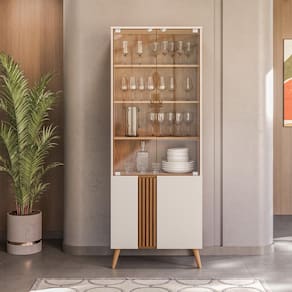 O detalhe ripado e os pés chanfrados reforçam a leveza do design, enquanto as portas e prateleiras internas garantem amplo espaço para organização e exposição de louças, taças e objetos decorativos.