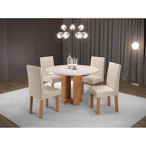 Mesas são indispensáveis para o funcionamento da casa e é no cômodo de confraternização que elas ganham protagonismo. Composto por peças de muito charme, o Conjunto Chiara com Venus torna o uso desse móvel importante com 4 cadeiras para garantir uma usabilidade plena para o seu dia a dia. Ideal para cozinhas e salas de jantar, Medida da Mesa (A x L x P): A:79,4 x L:90 x P:90cm Peso da Mesa: 20 kg Mesa suporta até: 50 kg Acabamento da Cadeira/Banco: Pintura UV Acabamento da Mesa: Pintura UV Ambiente Principal: Sala de Jantar Cadeira/Banco estofada: Encosto e Assento Estofados Cadeira/Banco suporta até: 90 kg Complexidade da Montagem: Média: pode ser montado por mais de uma pessoa e/ou necessite de maior conhecimento para montagem Cor: Mel/Blonde/Bege Cor da Base: Bege Cor do Produto: Mel/Blonde/Bege Cor do Tampo: Bege Cor Secundária: Bege De Canto (Canto Alemão): Não Enchimento do Assento: Espuma D-20 Enchimento do Encosto: Espuma D-12 Escala de Brilho: Semi-Brilho Espessura do Tampo: 25 mm Estrutura do Assento: MDF/Espuma Estrutura do Encosto: MDF/Espuma Formato do Tampo: Redondo Informações Complementares: Sala de Jantar 4 lugares Itens Inclusos: 1 Mesa, 4 cadeiras, kit ferragem, manual de montagem Manual de Montagem e Instalação: https://cdn2.madeiramadeira.com.br/atributo/viero-moveis/1283814-manual-base-vick-com-cad-venus.pdf Material da Base da Mesa: MDP Material da Estrutura da Cadeira: MDF/MDP Material do Tampo: MDF Medida da Cadeira/Banco (A x L x P): 98,5cmx42cmx48cm Medida do Tampo (L x C x E): 90cm x 90cm x 2,5cm Mesa Extensível: Não Necessita Montagem: Sim Origem do Produto: Nacional Peso da Cadeira/Banco: 7,1 kg Possui Apoio Para os Pés: Não Quantidade de Lugares: 04 Recomendações de Uso, Manutenção e Limpeza: Limpar com pano levemente umedecido com água Revestimento da Cadeira/Banco: Veludo Sistema de Montagem: Parafusos, cavilhas