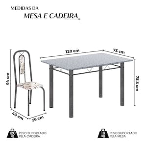 Quer deixar sua casa completa e prática? Uma dica bacana de como transformar o seu lar, deixando-o mais receptivo e bonito? Então você precisa de móveis indispensáveis para deixar seu lar muito mais aconchegante, receptivo e sempre disponível para receber a visita de amigos, familiares e convidados. Você vai se apaixonar por este incrível e moderno Conjunto de Mesa com 4 Cadeiras. Ideal para cozinha, ele é a melhor opção para completar o espaço que você desejar. Aproveite!! Medida da Mesa (A x L x P): 75,8 cm x 120 cm x 75 cm Peso da Mesa: 57,08 kg Mesa suporta até: 10.0000 Acabamento da Cadeira/Banco: Pintura Texturizada Acabamento da Mesa: Pintura Texturizada Ambiente Principal: Cozinha Cadeira/Banco Estofada: Encosto e Assento Estofados Cadeira/Banco estofada: Encosto e Assento Estofados Cadeira/Banco suporta até: 120.0000 codigo_ean: 7900288147820 Complexidade da Montagem: Baixa: pode ser montado por uma pessoa sozinha Cor: Arabesco/ Prata Cor do Produto: Arabesco/ Prata Cor Secundária: Bege De Canto (Canto Alemão): Não Enchimento do Assento: Espuma D-16 Escala de Brilho: Semi-Brilho Espessura do Tampo: 1,5 mm Estrutura do Assento: MDP Formato do Tampo: Retangular Itens Inclusos: 1 Mesa, 4 Cadeiras , Kit Ferragens e Manual de Montagem Linha ou Coleção: Lívia Manual de Montagem e Instalação: https://product-hub-prd.madeiramadeira.com.br/638345826/documents/3b481975-4c16-4f52-b7cc-2df64da454dbd2741541352817418186330048.pdf Marca: Soma Móveis Material da Base da Mesa: Aço Material da Estrutura da Cadeira: Aço Material do Tampo: Granito Medida da Cadeira/Banco (A x L x P): 94 cm x 36 cm x 40 cm Medida do Tampo (L x C x E): 120cm x 75cm x 1,5 cm Mesa Extensível: Não Necessita Montagem: Sim Origem do Produto: Nacional Peso da Cadeira/Banco: 2,28 kg Possui Apoio Para os Pés: Não Quantidade de Cadeiras: 4 Quantidade de Lugares: 04 Recomendações de Uso, Manutenção e Limpeza: Não permitir que molhe os pés da base, usar um pano de tecido macio e seco, evitar detergentes, alvejantes e produtos químicos de limpeza; no tampo usar tecido macio levemente umedecido. Revestimento da Cadeira/Banco: Couro Ecológico Sistema de Montagem: Parafusos