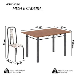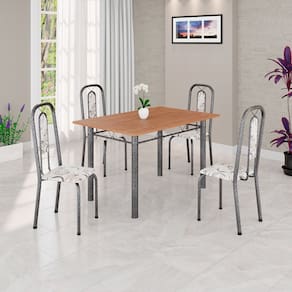 Quer deixar sua casa completa e prática? Uma dica bacana de como transformar o seu lar, deixando-o mais receptivo e bonito? Então você precisa de móveis indispensáveis para deixar seu lar muito mais aconchegante, receptivo e sempre disponível para receber a visita de amigos, familiares e convidados. Você vai se apaixonar por este incrível e moderno Conjunto de Mesa com 4 Cadeiras. Ideal para cozinha, ele é a melhor opção para completar o espaço que você desejar. Aproveite!! Medida da Mesa (A x L x P): 75,8 cm x 120 cm x 72 cm Peso da Mesa: 18,42 kg Mesa suporta até: 10.0000 Acabamento da Cadeira/Banco: Pintura Texturizada Acabamento da Mesa: Pintura Texturizada Ambiente Principal: Cozinha Cadeira/Banco Estofada: Encosto e Assento Estofados Cadeira/Banco estofada: Encosto e Assento Estofados Cadeira/Banco suporta até: 120.0000 codigo_ean: 7900288155634 Complexidade da Montagem: Baixa: pode ser montado por uma pessoa sozinha Cor: Arabesco / Prata Cor do Produto: Arabesco / Prata Cor Secundária: Bege De Canto (Canto Alemão): Não Enchimento do Assento: Espuma D-16 Escala de Brilho: Semi-Brilho Espessura do Tampo: 1,5 mm Estrutura do Assento: MDP Formato do Tampo: Retangular Itens Inclusos: 1 Mesa, 4 Cadeiras, Kit Ferragens e Manual de Montagem Linha ou Coleção: Lívia Manual de Montagem e Instalação: https://product-hub-prd.madeiramadeira.com.br/706898295/documents/de65823d-909a-445e-bea5-4bfd1c50e7da12743219352817418949403106.pdf Marca: Soma Móveis Material da Base da Mesa: Aço Material da Estrutura da Cadeira: Aço Material do Tampo: MDF Medida da Cadeira/Banco (A x L x P): 94 cm x 36 cm x 40 cm Medida do Tampo (L x C x E): 120cm x 72cm x 1,5 cm Mesa Extensível: Não Necessita Montagem: Sim Origem do Produto: Nacional Peso da Cadeira/Banco: 2,28 kg Possui Apoio Para os Pés: Não Quantidade de Cadeiras: 4 Quantidade de Lugares: 04 Recomendações de Uso, Manutenção e Limpeza: Não permitir que molhe os pés da base, usar um pano de tecido macio e seco, evitar detergentes, alvejantes e produtos químicos de limpeza; no tampo usar tecido macio levemente umedecido. Revestimento da Cadeira/Banco: Couro Ecológico Sistema de Montagem: Parafusos