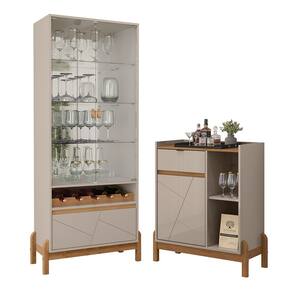 Características: Estrutura em MDF/MDP Acabamento em pintura UV 03 Portas sendo 02 de vidro temperado 4mm 02 Gavetas com corrediças telescópicas Drobadiças metálicas soft-close Puxadores da cristaleira em alça de couro sintético Puxadores do aparador em metal Gaveta e porta usinadas com detalhes frisados Pés em madeira maciça