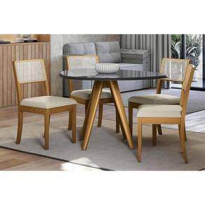 Sala de Jantar Completa Duna Premium Madeira Maciça c/ Tampo Madeirado c/ Vidro 135x105cm e 4 Cadeiras Lola Carvalho/Preto - Linho Bege Argila - Kappesberg