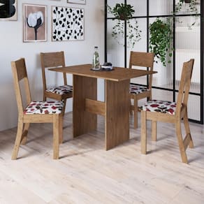 MATERIAL: MDP/MDF | CONTEÚDO DA EMBALAGEM: 1 Mesa, 4 Cadeiras, Kit Ferragens e Manual de Montagem | Quantidade de Lugares: 4 | Cor: Noce Assento Floral | MEDIDAS DA MESA: A: 77,5cm x L: 108cm x P: 68cm | MEDIDAS DA CADEIRA: A: 91cm x L: 39cm x P: 47cm | FORMATO DA MESA: Retangular | Atenção: Não nos responsabilizamos pela montagem ou instalação do produto | Produto: Conjunto de Mesa e Cadeiras