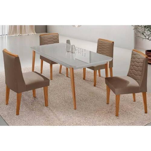 Sala de Jantar Completa Havana c/ Tampo Madeirado c/ Vidro Canto Curvo 120x80cm e 4 Cadeiras Maldivas Madeira Maciça Naturale/Off White - Capuccino/Suede Capuccino - Rufato Abaixo segue os produtos do KIT: Sala de Jantar Completa Havana c/ Tampo Madeirado c/ Vidro Canto Curvo 120x80cm e 4 Cadeiras Maldivas Madeira Maciça Naturale/Off White - Capuccino/Suede Capuccino - Rufato