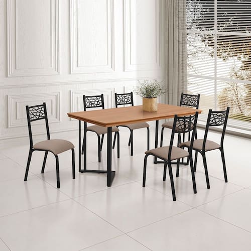 Tipo: Conjunto de Sala de Jantar Modelo: Industrial Michigan com Cadeiras Jasmin Cor: Tampo Castanho, Pés Pretos, Cadeiras com Assento Bege Detalhes do Produto