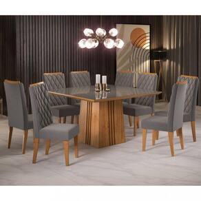 Características: Conjunto com estrutura em MDF/MDP Tampo com espessura 25mm Tampo Suporta até 50 kg distribuídos Acabamento sem-brilho Pintura UV 8 cadeiras Assento em MDP e espuma D16 Encosto em MDF Cada cadeira suporta até 90 kg Revestimento em tecido veludo