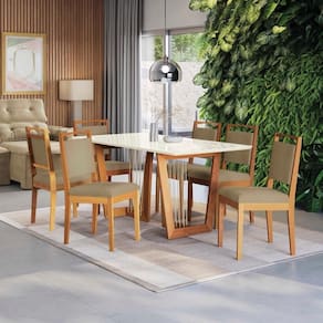 O destaque fica para o puxador em madeira na parte superior, que facilita o manuseio e evita sujar o tecido, garantindo um design e acabamento único para seu espaço, além de uma sala de jantar mais completa. Renove e transforme seu espaço com o Conjunto de Mesa da Sala de Jantar Premium Kappesberg.
