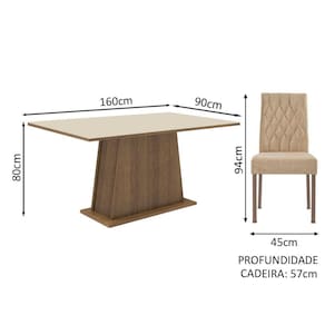 Itens inclusos: - Uma (1) mesa de 79 cm de altura com base pedestal e tampo de MDP com 160 cm de largura x 90 cm de comprimento com topo em pintura Crema - Seis (6) cadeiras de 94 cm de altura com encosto e assento estofados em tecido Suede Imperial