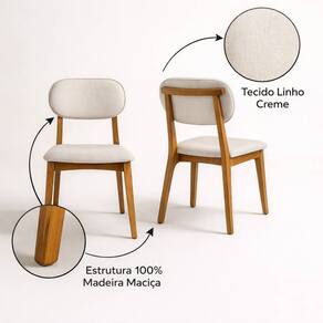 Caracteristicas da Cadeira: Material da Estrutura: Madeira Macica de Tauari Tratado, 100 Imunizado e Seco em Estufa Assento: Espuma D26 Soft Real Encosto: Espuma D26 Soft Real Assento/Pes: Reforcado Tecido Cadeira: Linho Tecido: Creme Embalagem Cadeiras: Caixa de Papelao -duas cadeiras montadas por caixa- Capacidade em KG por Lugar: Aproximadamente 150kg