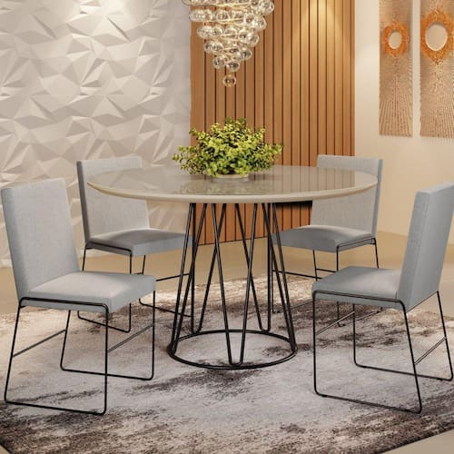 Se você pretende completar a sua casa com bom gosto e charme, então veja que mimo este lindo Conjunto de Mesa e Cadeiras. Não é uma excelente forma de começar? Super charmoso, ele é perfeito para que você dê um visual fancy e moderno para o seu lar. Medida da Mesa (A x L x P): 79cmx110cmx110cm Peso da Mesa: 25 Mesa suporta até: 25 Acabamento da Cadeira/Banco: Pintura Epóxi Acabamento da Mesa: Pintura Epóxi Almofada do assento: Fixa Ambiente Principal: Sala de Jantar Cadeira/Banco estofada: Encosto e Assento Estofados Cadeira/Banco suporta até: 100 Complexidade da Montagem: Baixa: pode ser montado por uma pessoa sozinha Cor: Linho Cinza Claro/Preto/Off White Cor da Base: Cobre Cor do Produto: Linho Cinza Claro/Preto/Off White Cor do Tampo: Marrom Cor Secundária: Preto De Canto (Canto Alemão): Não Design da Base: Cilindro Enchimento do Assento: Espuma D-23 Enchimento do Encosto: Espuma D-20 Escala de Brilho: Fosco Espessura do Tampo: 25 Espessura do Vidro: mm Estrutura do Assento: Aço Estrutura do Encosto: Aço Formato do Tampo: Retangular Informações Complementares: Tampo Chanfrado Laqueado Itens Inclusos: 1 Mesa, 4 Cadeiras, Kit Ferragens e Manual de Montagem Linha ou Coleção: Moderna Manual de Montagem e Instalação: https://cdn2.madeiramadeira.com.br/atributo/mais-acess-rios/871356-conjunto-dubai.pdf Material da Base da Mesa: Aço Material da Estrutura da Cadeira: Aço Material do Tampo: Vidro/MDF Medida da Base (A x L x P): 74cmx50cmx50cm Medida da Cadeira/Banco (A x L x P): 86cmx56cmx49cm Medida do Tampo (L x C x E): 110cmx110cmx3,4cm Mesa Extensível: Não Necessita Montagem: Sim Origem do Produto: Nacional Peso da Cadeira/Banco: 9,1549 kg Possui Apoio para Braços: Não Possui Apoio Para os Pés: Não Quantidade de Lugares: 04 Recomendações de Uso, Manutenção e Limpeza: Limpar com pano macio e levemente umedecido. Não utilizar solventes a base e de inflamáveis. Não utilizar produtos abrasivos. Revestimento da Cadeira/Banco: Linho Sistema de Montagem: Parafusos Vidro Temperado: Não