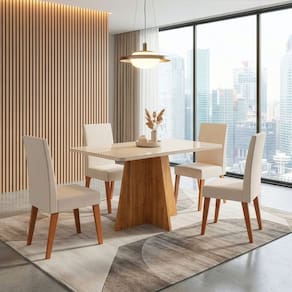O conjunto de mesa Anjos com 4 cadeiras Milano é ideal para quem busca unir elegância, conforto e funcionalidade na sala de jantar. A mesa conta com tampo em MDF com vidro colado na superfície, trazendo um visual moderno e fácil de limpar, além de uma base resistente que garante estabilidade e sofisticação ao ambiente. As cadeiras Milano são estofadas, oferecendo conforto para o uso diário, e possuem estrutura em madeira maciça, assegurando alta durabilidade, resistência e um acabamento refinado. Um conjunto harmonioso, perfeito para criar um espaço acolhedor e cheio de estilo.