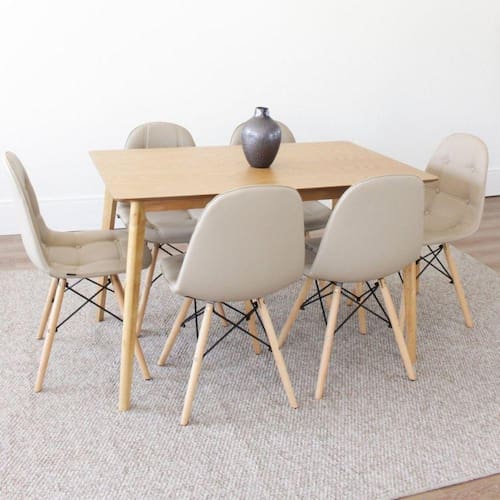 A Mesa Finlândia em madeira é ideal para quem busca elegância e praticidade, seu design rústico garante o detalhe que falta na decoração da sua casa. O conjunto com 6 cadeiras Eiffel Botonê completa o kit e garante o custo benefício para transformar o estilo divertido da sua casa com muita praticidade e toques de design. Conjunto composto por: uma Mesa com tampo em MDF de 19 mm, base em madeira seringueira + 6 cadeiras com assento revestido em PU, Base em madeira faia com armação em aço pintado. Suporta Até (kg): 120 Possui Rodízio: Não Altura do Conjunto: 82 cm Ambiente: null Ambiente Principal: Sala de Jantar Cor: Nude Informação Complementar: 1x Mesa de Jantar Retangular Finlândia MarromlLargura: 120 cmAltura: 75 cmPeso: 19 kgNecessita Montagem: Sim1x Kit 6 Cadeiras Botone Eiffel NudeLargura: 45Altura: 82Peso: 4.1Profundidade: 50Necessita Montagem: Sim Tamanho: