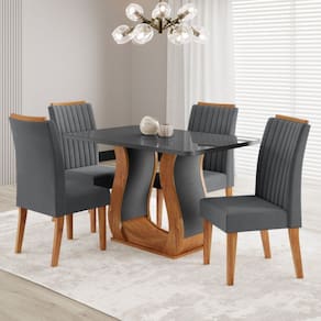 Transforme sua sala de jantar com um conjunto que une elegância e conforto. A mesa possui base estofada, trazendo sofisticação e um toque acolhedor ao ambiente. Seu tampo com cantos arredondados é produzido em MDF de 1,8cm, com acabamento refinado e protegido por vidro de 0,4cm, oferecendo resistência e fácil limpeza. O conjunto acompanha quatro cadeiras modelo Fran, fabricadas em MDP/MDF, garantindo durabilidade e estilo. Os assentos com espuma D26 proporcionam ótimo conforto, ideais para momentos à mesa. O encosto bordado acrescenta charme e exclusividade ao design. Revestidas em tecido veludo, as cadeiras trazem suavidade ao toque e um visual elegante. Perfeito para ambientes que valorizam o bom gosto e o bem-estar. Medida da Mesa (A x L x P): A:80,7 x L:120 x P:80cm Peso da Mesa: 48,05 kg Mesa suporta até: 50 kg Acabamento da Cadeira/Banco: Pintura UV Acabamento da Mesa: Pintura UV Acompanha Manual de Instalação: Sim Ambiente Principal: Sala de Jantar Cadeira/Banco Estofada: Encosto e Assento Estofados Cadeira/Banco estofada: Encosto e Assento Estofados Cadeira/Banco suporta até: 90 kg Cadeira/Banco Suporta Até: 90.0000 codigo_ean: 7900288274519 Complexidade da Montagem: Média: pode ser montado por mais de uma pessoa e/ou necessite de maior conhecimento para montagem Configuração do Conjunto: Mesa com Cadeiras Cor: Mel/Cinza Cor das Cadeiras: Cinza Cor do Produto: Mel/Cinza Cor do Tampo: Cinza Cor Secundária: Marrom De Canto (Canto Alemão): Não Enchimento do Assento: Espuma D-26 Enchimento do Encosto: Espuma D-12 Escala de Brilho: Semi-Brilho Espessura do Tampo: 18 mm Estrutura do Assento: MDP Estrutura do Encosto: MDP Formato do Tampo: Retangular Informações Complementares: Sala de Jantar 4 lugares Itens Inclusos: 1 Mesa, 4 Cadeiras, Kit Ferragens e Manual de Montagem Linha ou Coleção: Inspirare Manual de Montagem e Instalação: https://product-hub-prd.madeiramadeira.com.br/387470757/documents/8725fdac-2534-4825-b3e5-8876d61c1399328500052817610720262191.pdf Marca: Viero Material da Base da Mesa: MDP Material da Estrutura da Cadeira: MDF/MDP Material do Tampo: Vidro/MDF Material Principal: MDF/MDP Material Principal das Cadeiras/Bancos: MDF/MDP Medida da Cadeira/Banco (A x L x P): A:101 x L:42 x P:58,5cm Medida do Tampo (L x C x E): L:120 x C:80 x E:1,8cm Mesa Extensível: Não Necessita Montagem: Sim Origem do Produto: Nacional Peso da Cadeira/Banco: 8 kg Possui Apoio Para os Pés: Não Possui Vidro: Sim Quantidade de Cadeiras: 4 Quantidade de Lugares: 04 Recomendações de Uso, Manutenção e Limpeza: limpar com pano levemente umedecido em água Revestimento da Cadeira/Banco: Veludo Sistema de Montagem: Parafusos, cavilhas