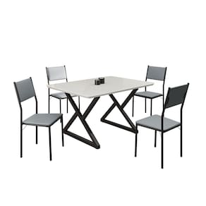 Este conjunto de mesa retangular e 4 cadeiras oferece estilo e praticidade. Com estrutura tubular em aço para estabilidade, o tampo em Mdf Laca off white com vidro adiciona sofisticação e resistência a riscos e manchas. As cadeiras combinam harmoniosamente com a mesa, garantindo conforto com estofamento. Ideal para diversos espaços, é perfeito para receber convidados ou desfrutar de refeições em família, criando um ambiente acolhedor e elegante. Medida da Mesa (A x L x P): 77,5cm x 120cm x 90cm Peso da Mesa: 39,6 kg Mesa suporta até: 10.0000 Acabamento da Cadeira/Banco: Pintura Texturizada Almofada do assento: Fixa Ambiente Principal: Sala de Jantar Cadeira/Banco estofada: Encosto e Assento Estofados Cadeira/Banco Estofada: Encosto e Assento Estofados Cadeira/Banco suporta até: 120.0000 codigo_ean: 7909903963142 Complexidade da Montagem: Baixa: pode ser montado por uma pessoa sozinha Cor: Grafite/Preto Cor do Produto: Grafite/Preto De Canto (Canto Alemão): Não Enchimento do Assento: Espuma D-12 Escala de Brilho: Semi-Fosco Espessura do Tampo: 25 mm Formato do Tampo: Retangular Itens Inclusos: 1 Mesa, 4 Cadeira, Manual De Montagem E Ferragens. Linha ou Coleção: Florença Manual de Montagem e Instalação: https://product-hub-prd.madeiramadeira.com.br/955287/documents/33ef6621-ca7d-440d-a613-e498bc9bec632158475524617216504680458.pdf Material da Base da Mesa: Aço Material da Estrutura da Cadeira: Aço Material do Tampo: MDF/Vidro Medida da Cadeira/Banco (A x L x P): 90,5cm x 44,5cm x 49cm Medida do Tampo (L x C x E): 90cm x 120cm x 2,5cm Mesa Extensível: Não Necessita Montagem: Sim Origem do Produto: Nacional Peso da Cadeira/Banco: 4,74 kg Possui Apoio Para os Pés: Não Quantidade de Lugares: 04 Recomendações de Uso, Manutenção e Limpeza: Usar um pano de tecido macio e seco, evitar detergentes, alvejantes e produtos químicos de limpeza; no tampo usar tecido macio levemente umedecido. Revestimento da Cadeira/Banco: Couro Ecológico Sistema de Montagem: Parafusos