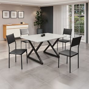 Este conjunto de mesa retangular e 4 cadeiras oferece estilo e praticidade. Com estrutura tubular em aço para estabilidade, o tampo em MDF Laca off white com vidro adiciona sofisticação e resistência a riscos e manchas. As cadeiras combinam harmoniosamente com a mesa, garantindo conforto com estofamento. Ideal para diversos espaços, é perfeito para receber convidados ou desfrutar de refeições em família, criando um ambiente acolhedor e elegante.