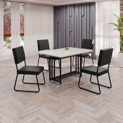 Este conjunto de mesa retangular e 4 cadeiras oferece estilo e praticidade. Com estrutura tubular em aço para estabilidade, o tampo em MDF Laca off white com vidro adiciona sofisticação e resistência a riscos e manchas. As cadeiras combinam harmoniosamente com a mesa, garantindo conforto com estofamento. Ideal para diversos espaços, é perfeito para receber convidados ou desfrutar de refeições em família, criando um ambiente acolhedor e elegante.