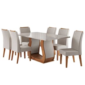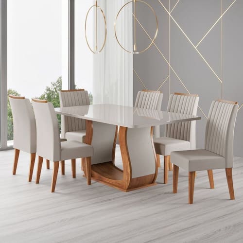 Encante sua sala de jantar com este conjunto que combina conforto, beleza e sofisticação. A mesa possui base estofada e tampo medindo 160x80 cm, com cantos arredondados em MDF de 1,8cm, garantindo elegância e segurança. O tampo é protegido por vidro de 0,4cm, que realça o visual e facilita a limpeza. Acompanha 6 cadeiras modelo Fran, fabricadas em MDP/MDF, com estrutura resistente e acabamento refinado. Os assentos são compostos por espuma D26, oferecendo excelente conforto. O encosto bordado traz um toque de exclusividade ao conjunto. Todas as cadeiras são revestidas em tecido veludo, que proporciona sofisticação e maciez ao toque. Ideal para ambientes modernos e acolhedores. Uma combinação perfeita entre design, funcionalidade e charme. Medida da Mesa (A x L x P): A:80,8 x L:160 x P:80cm Peso da Mesa: 51,8 kg Mesa suporta até: 50 kg Acabamento da Cadeira/Banco: Pintura UV Acabamento da Mesa: Pintura UV Acompanha Manual de Instalação: Sim Ambiente Principal: Sala de Jantar Cadeira/Banco Estofada: Encosto e Assento Estofados Cadeira/Banco estofada: Encosto e Assento Estofados Cadeira/Banco suporta até: 90 kg codigo_ean: 7900288184627 Complexidade da Montagem: Média: pode ser montado por mais de uma pessoa e/ou necessite de maior conhecimento para montagem Configuração do Conjunto: Mesa com Cadeiras Cor: Mel/Off White/Bege Cor das Cadeiras: Bege Cor do Produto: Mel/Off White/Bege Cor Secundária: Marrom De Canto (Canto Alemão): Não Enchimento do Assento: Espuma D-26 Escala de Brilho: Semi-Brilho Espessura do Tampo: 18 mm Estrutura do Assento: MDP Estrutura do Encosto: MDP Formato do Tampo: Retangular Informações Complementares: Sala de Jantar 6 lugares Itens Inclusos: 1 Mesa, 6 Cadeiras, Kit Ferragens e Manual de Montagem Linha ou Coleção: Inspirare Manual de Montagem e Instalação: https://product-hub-prd.madeiramadeira.com.br/147387407/documents/2413bd82-b3b4-4681-be78-20751ba4e67b301965252817509460803258.pdf Marca: Viero Material da Base da Mesa: MDP Material da Estrutura da Cadeira: MDF/MDP Material do Tampo: Vidro/MDF Material Principal: MDF/MDP Material Principal das Cadeiras/Bancos: MDF/MDP Medida da Cadeira/Banco (A x L x P): A:101 x L:42 x P:58,5cm Medida do Tampo (L x C x E): L:160 x C:80 x E:1,8cm Mesa Extensível: Não Necessita Montagem: Sim Origem do Produto: Nacional Peso da Cadeira/Banco: 8 kg Possui Apoio Para os Pés: Não Possui Vidro: Sim Quantidade de Cadeiras: 6 Quantidade de Lugares: 06 Recomendações de Uso, Manutenção e Limpeza: limpar com pano levemente umedecido em água Revestimento da Cadeira/Banco: Veludo Sistema de Montagem: Parafusos, cavilhas