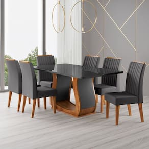 Encante sua sala de jantar com este conjunto que combina conforto, beleza e sofisticação. A mesa possui base estofada e tampo medindo 160x80 cm, com cantos arredondados em MDF de 1,8cm, garantindo elegância e segurança. O tampo é protegido por vidro de 0,4cm, que realça o visual e facilita a limpeza. Acompanha 6 cadeiras modelo Fran, fabricadas em MDP/MDF, com estrutura resistente e acabamento refinado. Os assentos são compostos por espuma D26, oferecendo excelente conforto. O encosto bordado traz um toque de exclusividade ao conjunto. Todas as cadeiras são revestidas em tecido veludo, que proporciona sofisticação e maciez ao toque. Ideal para ambientes modernos e acolhedores. Uma combinação perfeita entre design, funcionalidade e charme. Medida da Mesa (A x L x P): A:80,8 x L:160 x P:80cm Peso da Mesa: 51,8 kg Mesa suporta até: 50 kg Acabamento da Cadeira/Banco: Pintura UV Acabamento da Mesa: Pintura UV Acompanha Manual de Instalação: Sim Ambiente Principal: Sala de Jantar Cadeira/Banco Estofada: Encosto e Assento Estofados Cadeira/Banco estofada: Encosto e Assento Estofados Cadeira/Banco Suporta Até: 90.0000 Cadeira/Banco suporta até: 90 kg codigo_ean: 7900288270986 Complexidade da Montagem: Média: pode ser montado por mais de uma pessoa e/ou necessite de maior conhecimento para montagem Configuração do Conjunto: Mesa com Cadeiras Cor: Mel/Cinza Cor das Cadeiras: Cinza Cor do Produto: Mel/Cinza Cor do Tampo: Cinza Cor Secundária: Marrom De Canto (Canto Alemão): Não Enchimento do Assento: Espuma D-26 Escala de Brilho: Semi-Brilho Espessura do Tampo: 18 mm Estrutura do Assento: MDP Estrutura do Encosto: MDP Formato do Tampo: Retangular Informações Complementares: Sala de Jantar 6 lugares Itens Inclusos: 1 Mesa, 6 Cadeiras, Kit Ferragens e Manual de Montagem Linha ou Coleção: Inspirare Manual de Montagem e Instalação: https://product-hub-prd.madeiramadeira.com.br/886211359/documents/710c3b6b-4ecd-4ec3-93ec-0b446ba6606b328557552817610754923845.pdf Marca: Viero Material da Base da Mesa: MDP Material da Estrutura da Cadeira: MDF/MDP Material do Tampo: Vidro/MDF Material Principal: MDF/MDP Material Principal das Cadeiras/Bancos: MDF/MDP Medida da Cadeira/Banco (A x L x P): A:101 x L:42 x P:58,5cm Medida do Tampo (L x C x E): L:160 x C:80 x E:1,8cm Mesa Extensível: Não Necessita Montagem: Sim Origem do Produto: Nacional Peso da Cadeira/Banco: 8 kg Possui Apoio Para os Pés: Não Possui Vidro: Sim Quantidade de Cadeiras: 6 Quantidade de Lugares: 06 Recomendações de Uso, Manutenção e Limpeza: Limpar com pano levemente umedecido com água Revestimento da Cadeira/Banco: Veludo Sistema de Montagem: Parafusos, cavilhas