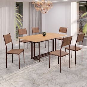 Este conjunto de mesa retangular e 6 cadeiras oferece estilo e praticidade. Com estrutura tubular em aço para estabilidade, o tampo em MDF cinamomo adiciona sofisticação e resistência a riscos e manchas. As cadeiras combinam harmoniosamente com a mesa, garantindo conforto com estofamento. Ideal para diversos espaços, é perfeito para receber convidados ou desfrutar de refeições em família, criando um ambiente acolhedor e elegante. Medida da Mesa (A x L x P): 77cm x 160cm x 90cm Peso da Mesa: 24,4 kg Mesa suporta até: 10.0000 Acabamento da Cadeira/Banco: Pintura Texturizada Acabamento da Mesa: Melamínico Ambiente Principal: Sala de Jantar Cadeira/Banco estofada: Encosto e Assento Estofados Cadeira/Banco Estofada: Encosto e Assento Estofados Cadeira/Banco suporta até: 120.0000 codigo_ean: 7909903964866 Complexidade da Montagem: Baixa: pode ser montado por uma pessoa sozinha Cor: Marrom Cor do Produto: Marrom De Canto (Canto Alemão): Não Enchimento do Assento: Espuma D-12 Escala de Brilho: Semi-Fosco Espessura do Tampo: 20 mm Formato do Tampo: Retangular Itens Inclusos: 1 MESA, 6 CADEIRAS, MANUAL DE MONTAGEM E FERRAGENS. Linha ou Coleção: Florença Manual de Montagem e Instalação: https://product-hub-prd.madeiramadeira.com.br/955924/documents/cba7bcac-2c75-4510-b5e9-6d53bd3ab54e2166902493817218241514412.pdf Material da Base da Mesa: Aço Material da Estrutura da Cadeira: Aço Material do Tampo: MDF Medida da Cadeira/Banco (A x L x P): 90,5cm x 44,5cm x 49cm Medida do Tampo (L x C x E): 90cm x 160cm x 2cm Mesa Extensível: Não Necessita Montagem: Sim Origem do Produto: Nacional Peso da Cadeira/Banco: 4,74 kg Possui Apoio Para os Pés: Não Quantidade de Lugares: 06 Recomendações de Uso, Manutenção e Limpeza: Usar um pano de tecido macio e seco, evitar detergentes, alvejantes e produtos químicos de limpeza; no tampo usar tecido macio levemente umedecido. Revestimento da Cadeira/Banco: Couro Ecológico Sistema de Montagem: PARAFUSOS