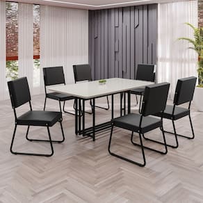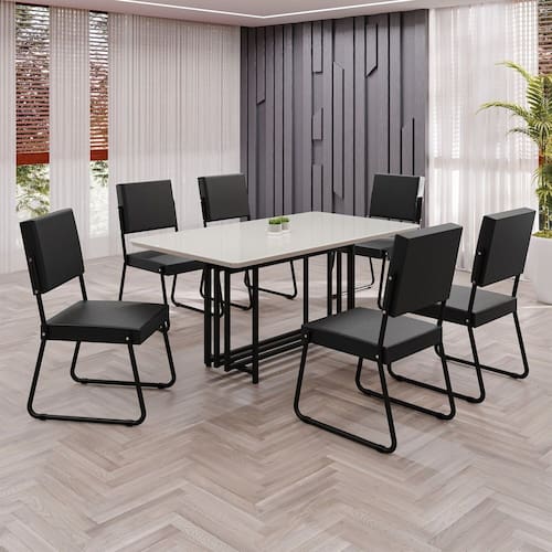 Este conjunto de mesa retangular e 6 cadeiras oferece estilo e praticidade. Com estrutura tubular em aço para estabilidade, o tampo em MDF Laca off white com vidro adiciona sofisticação e resistência a riscos e manchas. As cadeiras combinam harmoniosamente com a mesa, garantindo conforto com estofamento. Ideal para diversos espaços, é perfeito para receber convidados ou desfrutar de refeições em família, criando um ambiente acolhedor e elegante.