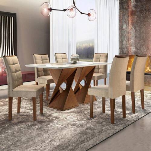 Características: Estrutura em MDF Tampo de vidro temperado retangular Mesa suporta até 40 kg Espessura do tampo de 25 mm 6 cadeiras estofadas Almofada do assento fixa Cada cadeira suporta até 120 kg Enchimento do encosto espuma D-20 Enchimento do assento espuma D-23 Acabamento em pintura UV