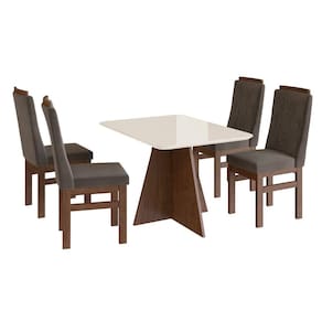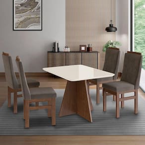 Mesas e Cadeiras são indispensáveis para o funcionamento da casa e é no cômodo de confraternização que elas ganham protagonismo. Composto por peças de muito charme, o conjunto de Mesa e Cadeiras ref:150/26 produzida em madeira maciça orna o uso desse móvel importante com mesas para 4 lugares para garantir uma usabilidade plena para o seu dia a dia. Ideal para cozinhas e salas de jantar, o kit oferece amplo espaço para que você possa dispor pratos, copos, talheres e até uma travessa com o quitute da vez, enquanto acomoda os convidados com aconchego e receptividade. Ah, para completar, é só combiná-la com o restante da mobília de sua preferência e criar o ambiente intimista perfeito para a sua rotina ou reuniões entre amigos. Medida da Mesa (A x L x P): 120x90x80 Peso da Mesa: 40 Mesa suporta até: 80 Acabamento da Cadeira/Banco: Pintura UV Acabamento da Mesa: Pintura UV Acompanha Manual de Instalação: Sim Almofada do assento: Fixa Almofada do encosto: Fixa Altura do Conjunto: 80 Ambiente Principal: Sala de Jantar Cadeira/Banco estofada: Encosto e Assento Estofados Cadeira/Banco suporta até: 120 Complexidade da Montagem: Baixa: pode ser montado por uma pessoa sozinha Cor: Marrom/Marrom/Off White Cor da Base: Marrom Cor do Produto: Marrom/Marrom/Off White Cor do Tampo: Off White Cor Flex: Marrom/joli marrom/ off white Cor Secundária: Marrom De Canto (Canto Alemão): Não Design da Base: Trapézio Enchimento do Assento: Espuma D-23 Enchimento do Encosto: Espuma D-14 Escala de Brilho: Semi-Brilho Espessura do Tampo: 30 Espessura do Vidro: mm Estrutura do Assento: HDF 12 Estrutura do Encosto: HDF 4 Formato do Tampo: Retangular Informações Complementares: Conjunto mesa com 4 cadeiras madeira maciça Itens Inclusos: 01 Tampo, 01 Base, 4 Cadeiras, Kit Ferragens e Manual de Montagem Linha ou Coleção: 2024 Manual de Especificação Técnica: https://product-hub-prd.madeiramadeira.com.br/883364/documents/88ea29cc-70de-44b5-b663-9160bd215b5d1701798cadeira26.pdf Manual de Montagem e Instalação: https://product-hub-prd.madeiramadeira.com.br/883364/documents/134bfd1f-60ff-49c4-b333-aa1404987b2e1701797manualref150.pdf Material da Base da Mesa: MDP Material da Estrutura da Cadeira: Madeira Maciça Material do Tampo: Vidro/MDF Material Principal: Vidro/MDP/MDF/Madeira Maciça Material Principal das Cadeiras/Bancos: Madeira Maciça Medida da Base (A x L x P): 75X67X41 CM Medida da Cadeira/Banco (A x L x P): 104X44X48 Medida do Tampo (L x C x E): 120X90X3 Mesa Dobrável: Não Mesa Extensível: Não Montagem Flex: Apenas conforme segue manual Necessita Montagem: Sim Origem do Produto: Nacional Peso da Cadeira/Banco: 9 Possui Apoio para Braços: Não Possui Apoio Para os Pés: Não Possui Prateleiras: Não Possui Rodízio: Não Possui Suporte Giratório: Não Possui Vidro: Sim Quantidade de Cadeiras: 4 Quantidade de Lugares: 04 Recomendações de Uso, Manutenção e Limpeza: Limpeza com pano macio e levemente umedecido Revestimento da Cadeira/Banco: Suede Sistema de Montagem: Parafusos, Cantoneiras, Tapa Furo e Cola Tipo de Assento: Fixo Tipo de Encosto: Estofado Vidro Temperado: Não