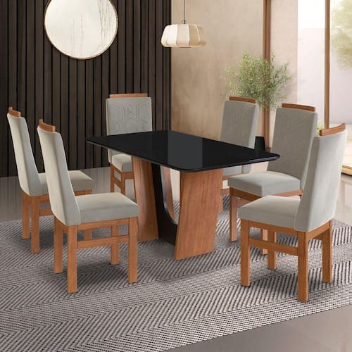 Mesas e Cadeiras são indispensáveis para o funcionamento da casa e é no cômodo de confraternização que elas ganham protagonismo. Composto por peças de muito charme, o conjunto de Mesa e Cadeiras ref:136/26 produzida em madeira maciça orna o uso desse móvel importante com mesas para 6 lugares para garantir uma usabilidade plena para o seu dia a dia. Ideal para cozinhas e salas de jantar, o kit oferece amplo espaço para que você possa dispor pratos, copos, talheres e até uma travessa com o quitute da vez, enquanto acomoda os convidados com aconchego e receptividade. Ah, para completar, é só combiná-la com o restante da mobília de sua preferência e criar o ambiente intimista perfeito para a sua rotina ou reuniões entre amigos. Medida da Mesa (A x L x P): 160x90x80 Peso da Mesa: 50 kg Mesa suporta até: 80 kg Acabamento da Cadeira/Banco: Pintura UV Acabamento da Mesa: Pintura UV Acompanha Manual de Instalação: Não Almofada do assento: Fixa Almofada do encosto: Fixa Altura do Conjunto: 80 cm Ambiente Principal: Sala de Jantar Cadeira/Banco estofada: Encosto e Assento Estofados Cadeira/Banco suporta até: 120 kg Complexidade da Montagem: Baixa: pode ser montado por uma pessoa sozinha Cor: Canela/preto/joli Creme Cor da Base: Marrom Cor do Produto: Canela/preto/joli Creme Cor do Tampo: Preto Cor Flex: Canela/joli Creme Cor Secundária: Marrom De Canto (Canto Alemão): Não Design da Base: Trapézio Enchimento do Assento: Espuma D-23 Enchimento do Encosto: Espuma D-12 Escala de Brilho: Fosco Espessura do Tampo: 30 mm Espessura do Vidro: mm Estrutura do Assento: HDF 12 Estrutura do Encosto: HDF 4 Formato do Tampo: Retangular Informações Complementares: Conjunto mesa com 6 cadeiras madeira maciça Itens Inclusos: 01 Tampo, 01 Base, 6 Cadeiras, Kit Ferragens, 01 Manual Linha ou Coleção: 2024 Manual de Especificação Técnica: https://product-hub-prd.madeiramadeira.com.br/897588/documents/bdd131c0-af53-48de-ab3d-650d266f73b31839788cadeira26.pdf Manual de Montagem e Instalação: https://product-hub-prd.madeiramadeira.com.br/897588/documents/8c1f3692-4820-4738-aaec-0c8db27d32bb1839787base136.pdf Material da Base da Mesa: MDP Material da Estrutura da Cadeira: Madeira Maciça Material do Tampo: Vidro/MDF Material Principal: Vidro/MDP/MDF/Madeira Maciça Material Principal das Cadeiras/Bancos: Madeira Maciça Medida da Base (A x L x P): 75X67X41 CM Medida da Cadeira/Banco (A x L x P): 104X44X48 Medida do Tampo (L x C x E): 160X90X3 Mesa Dobrável: Não Mesa Extensível: Não Montagem Flex: Apenas conforme segue manual Necessita Montagem: Sim Origem do Produto: Nacional Peso da Cadeira/Banco: 9 kg Possui Apoio para Braços: Não Possui Apoio Para os Pés: Não Possui Prateleiras: Não Possui Rodízio: Não Possui Suporte Giratório: Não Possui Vidro: Sim Quantidade de Cadeiras: 6 Quantidade de Lugares: 06 Recomendações de Uso, Manutenção e Limpeza: Limpeza com pano macio e levemente umedecido Revestimento da Cadeira/Banco: Suede Sistema de Montagem: Parafusos, Cantoneiras, Tapa Furo e Cola Tipo de Assento: Fixo Tipo de Encosto: Estofado