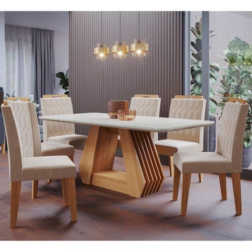A sala de jantar Agata com 1,80x0,90m e 6 cadeiras Paola é uma excelente opção para reunir a família em momentos especiais. A mesa Agata destaca-se por sua base triangular e tampo em MDF/vidro com bordas chanfradas e acabamento em laca, combinando elegância e modernidade. As cadeiras Paola são uma fusão de estilo, conforto e funcionalidade, com estrutura de madeira que oferece durabilidade e um toque rústico sofisticado. O estofamento de alta qualidade garante conforto, e o sistema de fácil montagem das cadeiras torna o conjunto ainda mais funcional.