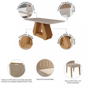 Características Cadeira: Acompanha 6 cadeiras Encosto com detalhes bordado frente e verso Espuma de alta densidade Moldura em MDF 25mm com bordas laqueadas Pés em MDF 25mm com bordas laqueadas Suporta até 100kg