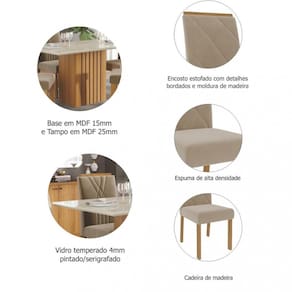Características Cadeira: Acompanha 6 cadeiras Encosto estofado com detalhes bordados Espuma de alta densidade Estrutura em Madeira Pés em Madeira Suporta até 100kg