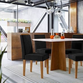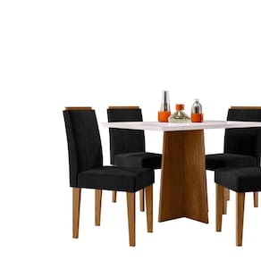 Belíssima Mesa Anitta, vai levar charme e beleza para sua casa. Produzido com material de alta qualidade proporciona mais resistência e durabilidade. Possuí pés diferenciados com design moderno e elegante, além do encaixe ideal para as cadeiras se acomodarem perfeitamente, ajudando a otimizar seu espaço. Medida da Mesa (A x L x P): 80cmX120cmX80cm Peso da Mesa: 39,6 kg Mesa suporta até: 20.0000 Acabamento da Cadeira/Banco: Pintura UV Acabamento da Mesa: Pintura UV Ambiente Principal: Sala de Jantar Cadeira/Banco Estofada: Encosto e Assento Estofados Cadeira/Banco estofada: Encosto e Assento Estofados Cadeira/Banco suporta até: 120.0000 codigo_ean: 7900288113351 Complexidade da Montagem: Média: pode ser montado por mais de uma pessoa e/ou necessite de maior conhecimento para montagem Cor: Off White Cor do Produto: Off White Cor do Tampo: Off White Cor Secundária: Cinza De Canto (Canto Alemão): Não Enchimento do Assento: Espuma D-18 Escala de Brilho: Semi-Brilho Espessura do Tampo: 28 mm Formato do Tampo: Retangular Informações Complementares: Tecido da cadeira cor Veludo Preto Itens Inclusos: 1 Mesa, 4 Cadeiras Manual de Montagem e Kit Ferragens Manual de Montagem e Instalação: https://product-hub-prd.madeiramadeira.com.br/992117/documents/b456c681-a97f-4451-9433-1fb097449e6f2808091291317440684550732.pdf Marca: New Ceval Móveis Material da Base da Mesa: MDF Material da Estrutura da Cadeira: MDF Material do Tampo: Vidro/MDF Medida da Cadeira/Banco (A x L x P): 99cmX45cmX59cm Medida do Tampo (L x C x E): 120cmX80cmX25cm Mesa Dobrável: Não Mesa Extensível: Não Necessita Montagem: Sim Origem do Produto: Nacional Peso da Cadeira/Banco: 7,9 kg Possui Apoio para Braços: Não Possui Apoio Para os Pés: Não Possui Suporte Giratório: Não Quantidade de Cadeiras: 4 Quantidade de Lugares: 04 Recomendações de Uso, Manutenção e Limpeza: Limpar com flanela limpa e seca. Não molhar o móvel e não expor em lugar úmido ou próximo de fontes de calor, não usar produtos abrasivos. Revestimento da Cadeira/Banco: Poliéster Sistema de Montagem: Parafusos, cavilhas e minifix