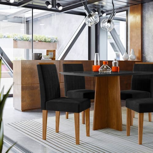 Belíssima Mesa Anitta, vai levar charme e beleza para sua casa. Produzido com material de alta qualidade proporciona mais resistência e durabilidade. Possuí pés diferenciados com design moderno e elegante, além do encaixe ideal para as cadeiras se acomodarem perfeitamente, ajudando a otimizar seu espaço. Medida da Mesa (A x L x P): 80cmX120cmX80cm Peso da Mesa: 39,6 kg Mesa suporta até: 20.0000 Acabamento da Cadeira/Banco: Pintura UV Acabamento da Mesa: Pintura UV Ambiente Principal: Sala de Jantar Cadeira/Banco Estofada: Encosto e Assento Estofados Cadeira/Banco estofada: Encosto e Assento Estofados Cadeira/Banco suporta até: 120.0000 codigo_ean: 7900288113375 Complexidade da Montagem: Média: pode ser montado por mais de uma pessoa e/ou necessite de maior conhecimento para montagem Cor: Preto Cor do Produto: Preto Cor do Tampo: Preto Cor Secundária: Cinza De Canto (Canto Alemão): Não Enchimento do Assento: Espuma D-18 Escala de Brilho: Semi-Brilho Espessura do Tampo: 28 mm Formato do Tampo: Retangular Informações Complementares: tecido do assento da cadeira cor Veludo preto Itens Inclusos: 1 Mesa, 4 Cadeiras Manual de Montagem e Kit Ferragens Manual de Montagem e Instalação: https://product-hub-prd.madeiramadeira.com.br/992119/documents/fe4c2af4-0986-43b6-8113-86a27ed4a5702808105291317440688123646.pdf Marca: New Ceval Móveis Material da Base da Mesa: MDF Material da Estrutura da Cadeira: MDF Material do Tampo: Vidro/MDF Medida da Cadeira/Banco (A x L x P): 99cmX45cmX59cm Medida do Tampo (L x C x E): 120cmX80cmX25cm Mesa Dobrável: Não Mesa Extensível: Não Necessita Montagem: Sim Origem do Produto: Nacional Peso da Cadeira/Banco: 7,9 kg Possui Apoio para Braços: Não Possui Apoio Para os Pés: Não Possui Suporte Giratório: Não Quantidade de Cadeiras: 4 Quantidade de Lugares: 04 Recomendações de Uso, Manutenção e Limpeza: Limpar com flanela limpa e seca. Não molhar o móvel e não expor em lugar úmido ou próximo de fontes de calor, não usar produtos abrasivos. Revestimento da Cadeira/Banco: Poliéster Sistema de Montagem: Parafusos, cavilhas e minifix