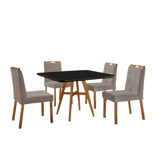 Conjunto Sala De Jantar Mesa Atenas 90x90cm Preto Com 4 Cadeiras Bela Veludo Cinza