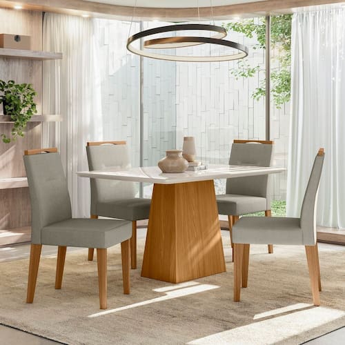 Dê um upgrade na decoração da sala de jantar com nosso conjunto de mesa de jantar! Este conjunto traz um toque moderno e sofisticado ao seu ambiente, ideal para jantares em família ou reuniões com amigos. Sua estrutura robusta uma super durabilidade. A mesa com tampo de vidro é espaçosa o suficiente para acomodar todos, enquanto as cadeiras oferecem conforto durante longas conversas. Transforme suas refeições em verdadeiros momentos de conexão e sabor! Não perca a chance de criar memórias inesquecíveis ao redor desse conjunto Bárbara incrível! Medida da Mesa (A x L x P): 80cmX135cmX90cm Peso da Mesa: 46,3 kg Mesa suporta até: 20.0000 Acabamento da Cadeira/Banco: Pintura UV Acabamento da Mesa: Pintura UV Ambiente Principal: Sala de Jantar Cadeira/Banco estofada: Encosto e Assento Estofados Cadeira/Banco Estofada: Encosto e Assento Estofados Cadeira/Banco suporta até: 120.0000 codigo_ean: 7900288117489 Complexidade da Montagem: Média: pode ser montado por mais de uma pessoa e/ou necessite de maior conhecimento para montagem Cor: Ype/Off White/Ln04 Cor do Produto: Ype/Off White/Ln04 Cor do Tampo: Off White Cor Secundária: Bege De Canto (Canto Alemão): Não Enchimento do Assento: Espuma D-18 Escala de Brilho: Semi-Brilho Espessura do Tampo: 28 mm Formato do Tampo: Retangular Informações Complementares: Tecido do assento (Ln04) LINHO PALHA Itens Inclusos: 1 Mesa, 4 Cadeiras, Manual de Montagem e Kit Ferragens Manual de Montagem e Instalação: https://product-hub-prd.madeiramadeira.com.br/999904/documents/209d8f49-956a-4560-bffd-0d2eba092cbf2840515291317442935866374.pdf Marca: New Ceval Móveis Material da Base da Mesa: MDF Material da Estrutura da Cadeira: Madeira Material do Tampo: Vidro/MDF Medida da Cadeira/Banco (A x L x P): 98,5cmx47cmx60cm Medida do Tampo (L x C x E): 135cmX90cmX28cm Mesa Dobrável: Não Mesa Extensível: Não Necessita Montagem: Sim Origem do Produto: Nacional Peso da Cadeira/Banco: 7,85 kg Possui Apoio para Braços: Não Possui Apoio Para os Pés: Não Possui Suporte Giratório: Não Quantidade de Cadeiras: 4 Quantidade de Lugares: 04 Recomendações de Uso, Manutenção e Limpeza: Limpar com flanela limpa e seca. Não molhar o móvel e não expor em lugar úmido ou próximo de fontes de calor, não usar produtos abrasivos. Revestimento da Cadeira/Banco: Poliéster Sistema de Montagem: Parafusos, cavilhas e minifix