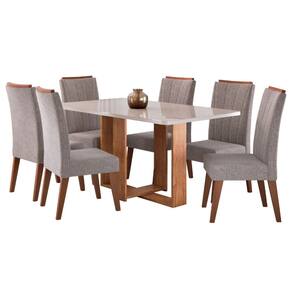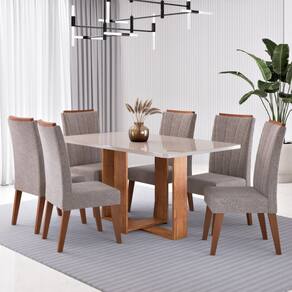 Características: Estrutura MDP 6 Cadeiras Cadeira em madeira eucalipto Cada cadeira suporta até 90kg Revestimento com tecido linho Encosto bordado com espaldar Assento D26 Tampo com canto arredondado Mesa suporta até 50kg distribuído Tampo MDF 18mm Vidro 4mm