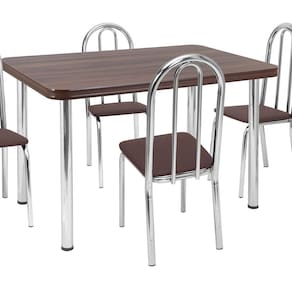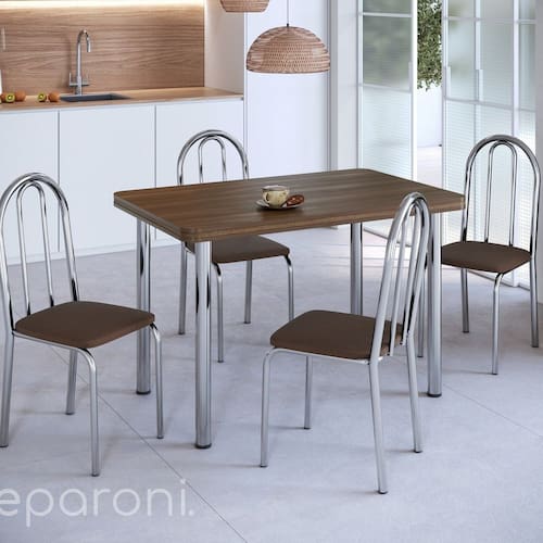 Tre Paroni Móveis, fabricante de móveis há mais de 36 anos, produzindo design com qualidade. Apresenta seu conjunto de mesa de jantar com tampo de 45 mm em MDP/BP e pés cromados, ideal para cozinha ou sala de jantar, acompanhada de 4 cadeiras cromadas revestidas em couro sintético com assento em espuma D15, proporcionando conforto e bem estar. Medida da Mesa (A x L x P): 78 cm x 120 cm x 75 cm Peso da Mesa: 18,6 kg Mesa suporta até: 60.0000 Acabamento da Cadeira/Banco: Cromado Acabamento da Mesa: Cromado Acompanha Manual de Instalação: Sim Almofada do assento: Fixa Ambiente Principal: Cozinha Cadeira/Banco estofada: Somente Assento Estofado Cadeira/Banco Estofada: Somente Assento Estofado Cadeira/Banco suporta até: 110.0000 codigo_ean: 7909903961261 Complexidade da Montagem: Baixa: pode ser montado por uma pessoa sozinha Cor: Cromado/Nogueira/Preto Cor do Produto: Cromado/Nogueira/Preto Cor Flex: Não De Canto (Canto Alemão): Não Design da Base: 4 Pés Escala de Brilho: Brilhante Espessura do Tampo: 45 mm Estrutura do Assento: Aglomerado Estrutura do Encosto: Aço cromado Formato do Tampo: Retangular Itens Inclusos: 1 Mesa, 4 Cadeiras e Manual de Montagem Manual de Montagem e Instalação: https://product-hub-prd.madeiramadeira.com.br/956395/documents/976c4687-2732-4c36-84b7-8322823b6e7a2419779492517279846425099.pdf Material da Base da Mesa: Aço Cromado Material da Estrutura da Cadeira: Aço Material do Tampo: MDP Material Principal: Aço Cromado Material Principal das Cadeiras/Bancos: Aço Medida da Base (A x L x P): 78 cm x 120 cm x 75 cm Medida da Cadeira/Banco (A x L x P): 92 cm x 38 cm x 45 cm Medida do Tampo (L x C x E): 120 cm x 75 cm x 4,5 cm Mesa Dobrável: Não Mesa Extensível: Não Montagem Flex: Não Necessita Montagem: Sim Origem do Produto: Nacional Peso da Cadeira/Banco: 4,5 kg Possui Apoio para Braços: Não Possui Apoio Para os Pés: Não Possui Prateleiras: Não Possui Suporte Giratório: Não Possui Vidro: Não Quantidade de Cadeiras: 4 Quantidade de Lugares: 04 Recomendações de Uso, Manutenção e Limpeza: Deve ser feita com pano macio e seco ou levemente umedecido com água e sabão neutro. Não devem ser utilizados abrasivos como palha de aço e objetos cortantes. Sistema de Montagem: Parafusos e Minifix Tipo de Assento: Fixo Tipo de Encosto: Fixo