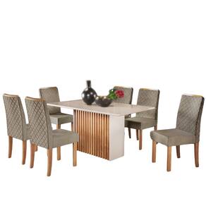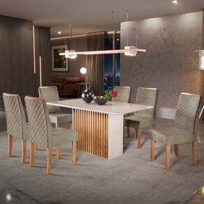 O Conjunto Sala de Jantar Mesa Cris Piccola 136cm e 6 Cadeiras Veludo Elegance Nuova Sonetto une sofisticação e conforto para transformar seu ambiente. A mesa de 136 cm possui estrutura em MDF, tampo com vidro de 3 mm, cantos arredondados e detalhe frisado na base, suportando até 100 kg, garantindo charme e segurança. As cadeiras são estofadas com espuma D20 e revestidas em veludo, com encosto bordado e estrutura em MDF/MDP, suportando até 100 kg cada. Ideal para quem busca elegância e funcionalidade na sala de jantar.