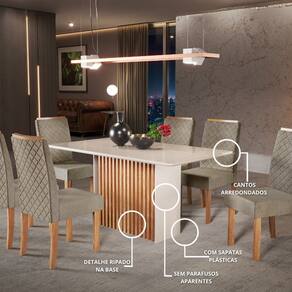 Características Cadeira: 6 Cadeiras Densidade espuma D20 Encosto bordado Estrutura em MDF e MDP Peso máximo suportado 100kg Tecido veludo