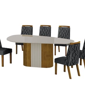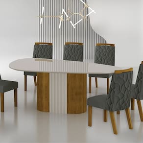 Conjunto sala de jantar mesa Dacota 2,00 m tampo orgânico com vidro, 06 cadeiras Dacota com assento e encosto estofados, detalhe da base ripado, dimensões da mesa: Altura: 750 mm Largura 1000 mm, comprimento: 2000 mm, com esse conjunto de sala de jantar sua sala irá ficar ainda mais linda e elegante. Medida da Mesa (A x L x P): 75x100x200 Peso da Mesa: 76,4 kg Mesa suporta até: 25.0000 Acabamento da Cadeira/Banco: Pintura UV Acabamento da Mesa: Pintura UV Ambiente Principal: Sala de Jantar Cadeira/Banco estofada: Encosto e Assento Estofados Cadeira/Banco Estofada: Encosto e Assento Estofados Cadeira/Banco suporta até: 120.0000 codigo_ean: 7900288100894 Complexidade da Montagem: Média: pode ser montado por mais de uma pessoa e/ou necessite de maior conhecimento para montagem Cor: freijo/cinza Cor do Produto: Freijo/Cinza Cor Secundária: Marrom De Canto (Canto Alemão): Não Enchimento do Assento: Espuma D-20 Escala de Brilho: Fosco Espessura do Tampo: 25 mm Estrutura do Assento: MDF Formato do Tampo: Oval Itens Inclusos: 1 Mesa, 6 Cadeiras, Kit Ferragens, 1 Manual de Montagem. Manual de Montagem e Instalação: https://product-hub-prd.madeiramadeira.com.br/983104/documents/3c5352d9-30a9-408e-811b-b0fd2d675233276464888017429906467408.pdf Marca: Leifer Material da Base da Mesa: MDF Material da Estrutura da Cadeira: MDF Material do Tampo: MDF Material Principal: MDF Medida da Cadeira/Banco (A x L x P): 97,5x44x59 Medida do Tampo (L x C x E): 100x200x75 Mesa Extensível: Não Necessita Montagem: Sim Origem do Produto: Nacional Peso da Cadeira/Banco: 9,1 kg Possui Apoio Para os Pés: Não Quantidade de Cadeiras: 6 Quantidade de Lugares: 06 Recomendações de Uso, Manutenção e Limpeza: Limpar com pano úmido, quase seco. Revestimento da Cadeira/Banco: Linho Sistema de Montagem: Parafusos