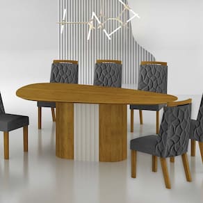 Conjunto sala de jantar mesa Dacota 2,00 m tampo orgânico sem vidro, 06 cadeiras Dacota com assento e encosto estofados, detalhe da base ripado, dimensões da mesa: Altura: 750 mm Largura 1000 mm, comprimento: 2000 mm, com esse conjunto de sala de jantar sua sala irá ficar ainda mais linda e elegante. Medida da Mesa (A x L x P): 75x100x200 Peso da Mesa: 60,4 kg Mesa suporta até: 25.0000 Acabamento da Cadeira/Banco: Pintura UV Acabamento da Mesa: Pintura UV Ambiente Principal: Sala de Jantar Cadeira/Banco Estofada: Encosto e Assento Estofados Cadeira/Banco estofada: Encosto e Assento Estofados Cadeira/Banco suporta até: 120.0000 codigo_ean: 7900288100702 Complexidade da Montagem: Média: pode ser montado por mais de uma pessoa e/ou necessite de maior conhecimento para montagem Cor: Freijó/Linho Cinza Cor do Produto: Freijo/Linho cinza Cor Secundária: Marrom De Canto (Canto Alemão): Não Enchimento do Assento: Espuma D-20 Escala de Brilho: Fosco Espessura do Tampo: 25 mm Estrutura do Assento: MDF Formato do Tampo: Oval Itens Inclusos: 1 Mesa, 6 Cadeiras, Kit Ferragens, 1 Manual de Montagem. Manual de Montagem e Instalação: https://product-hub-prd.madeiramadeira.com.br/983111/documents/3890db62-9ed2-4481-a180-86856144d416276464888017429906467408.pdf Marca: Leifer Material da Base da Mesa: MDF Material da Estrutura da Cadeira: MDF Material do Tampo: MDF Material Principal: MDF Medida da Cadeira/Banco (A x L x P): 97,5x44x59 Medida do Tampo (L x C x E): 100x200x75 Mesa Extensível: Não Necessita Montagem: Sim Origem do Produto: Nacional Peso da Cadeira/Banco: 9,1 kg Possui Apoio Para os Pés: Não Quantidade de Cadeiras: 6 Quantidade de Lugares: 06 Recomendações de Uso, Manutenção e Limpeza: Limpar com pano úmido, quase seco. Revestimento da Cadeira/Banco: Linho Sistema de Montagem: Parafusos