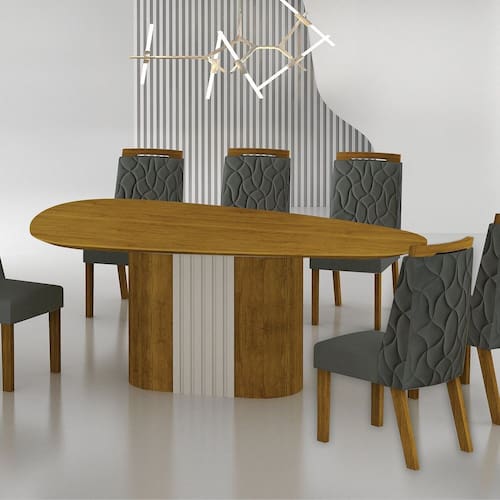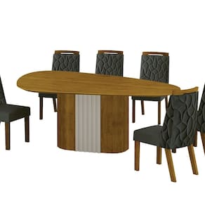 Conjunto sala de jantar mesa Dacota 2,00 m tampo orgânico sem vidro, 06 cadeiras Dacota com assento e encosto estofados, detalhe da base ripado, dimensões da mesa: Altura: 750 mm Largura 1000 mm, comprimento: 2000 mm, com esse conjunto de sala de jantar sua sala irá ficar ainda mais linda e elegante.
